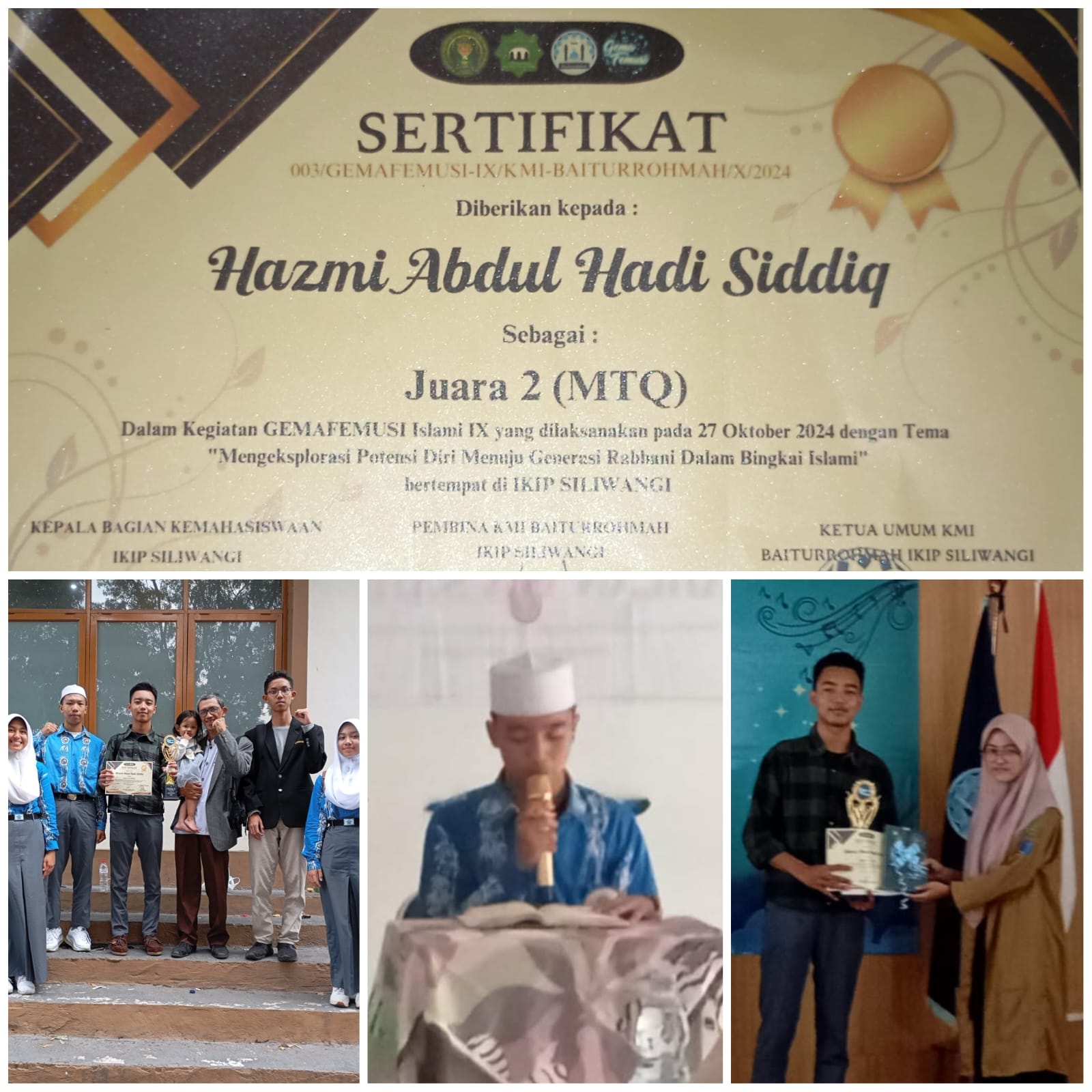 Pada ajang ini, Hazmi Abdul Hadi Siddiq, siswa kelas X TOI C SMK Negeri 1 Cimahi, berhasil meraih Juara 2 dalam kategori lomba Musabaqah Tilawatil Qur’an (MTQ). Hazmi menampilkan kemampuannya yang luar biasa dalam membaca Al-Qur’an dengan penuh keindahan dan kekhusyukan, sehingga mampu bersaing di antara para peserta lainnya dari berbagai sekolah.
