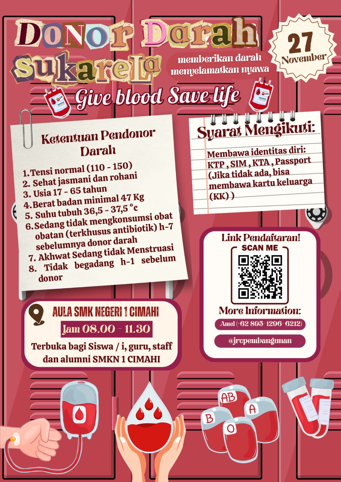 Palang Merah Remaja (PMR) SMK Negeri 1 Cimahi kembali menggelar kegiatan Donor Darah bekerja sama dengan PMI Kota Bandung pada Kamis, 27 November 2025. Kegiatan sosial ini berlangsung di Aula SMKN 1 Cimahi mulai pukul 08.00 WIB hingga selesai dan mendapat antusiasme yang sangat tinggi dari warga sekolah maupun masyarakat umum.